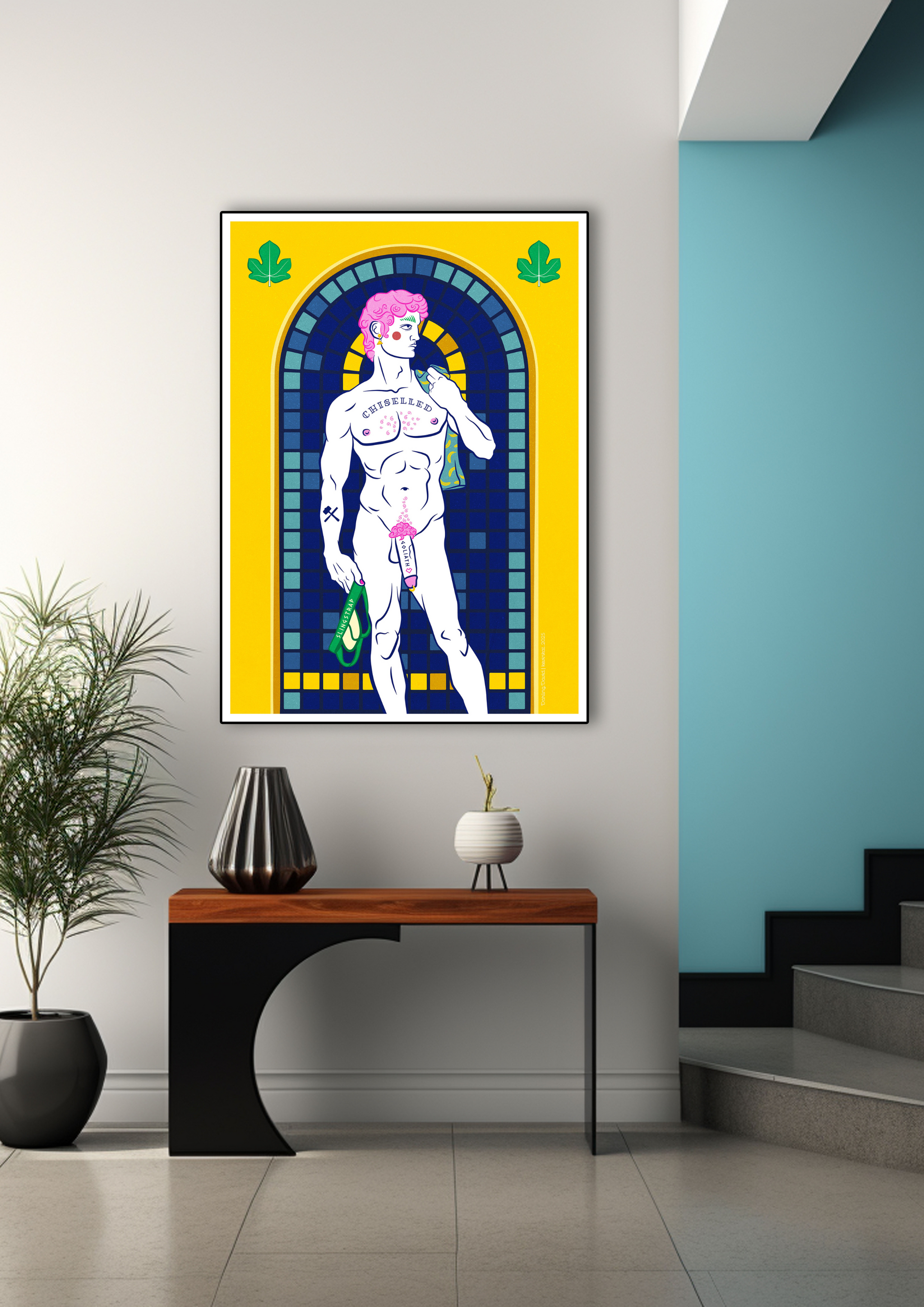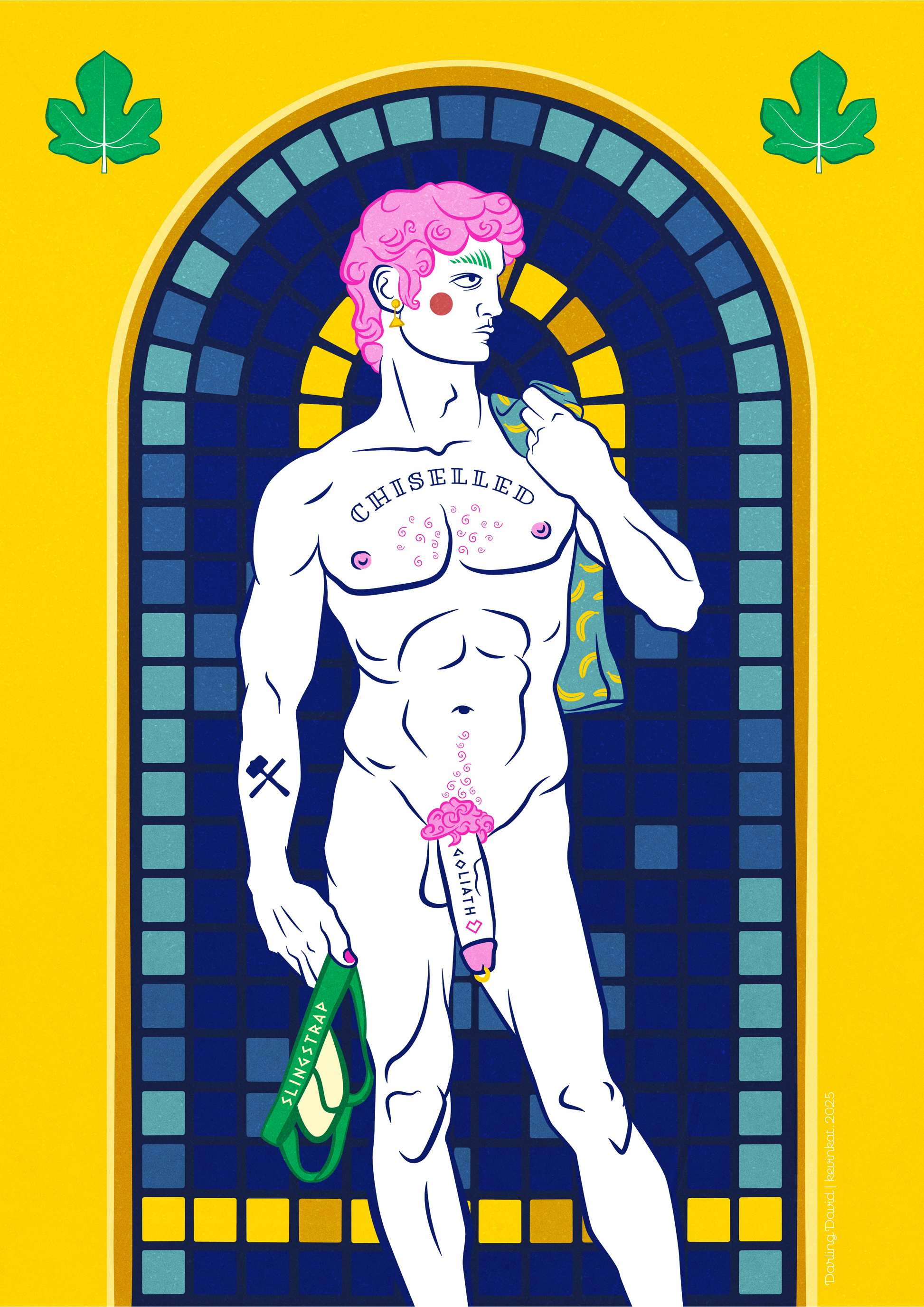 He’s chiselled, cheeky, and packing a Goliath of his own. Darling David reclaims the classic sculpture with pink curls, perfect posture, and a not-so-subtle twist on modesty. The jockstrap is a little tongue in cheek reference to the slingshot used to bring down a giant. This isn’t your average renaissance revival - it’s queer, camp, and carved to perfection. The fig leaves reference Queen Victoria’s attempt at censoring David’s willy, and the hammer & chisel tattoo winks at Michelangelo, who surely had to be gay looking at his timeless appreciation of the male form.