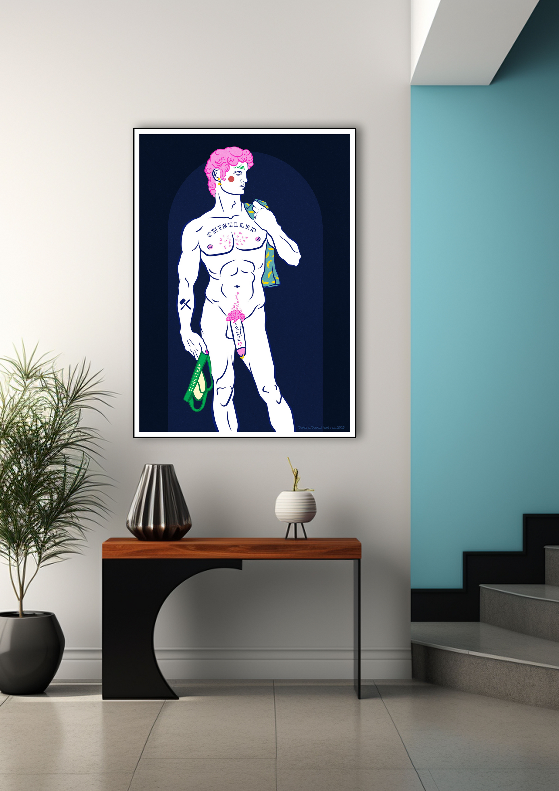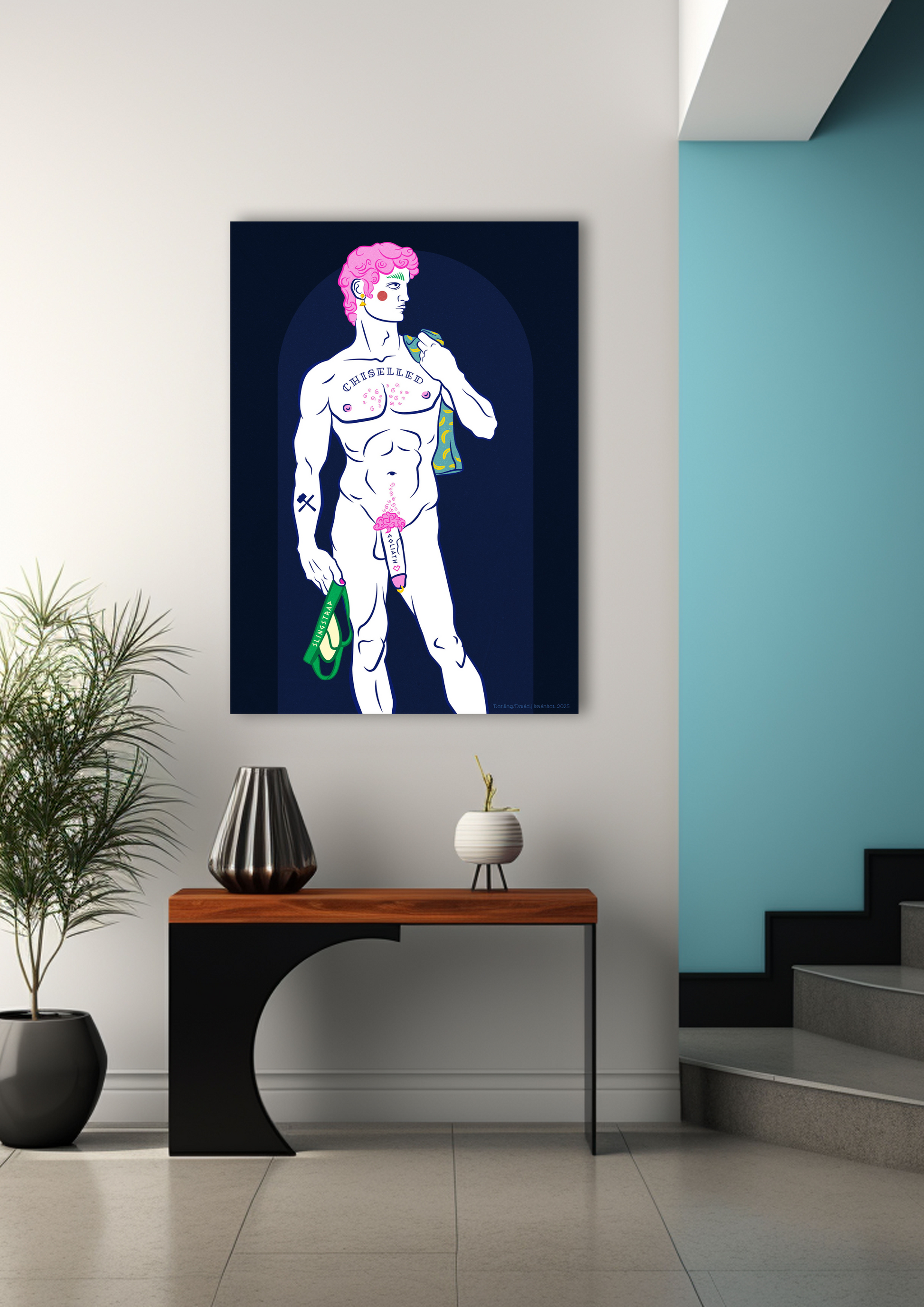 He’s chiselled, cheeky, and packing a Goliath of his own. Darling David reclaims the classic sculpture with pink curls, perfect posture, and a not-so-subtle twist on modesty. The jockstrap is a little tongue in cheek reference to the slingshot used to bring down a giant. This isn’t your average renaissance revival - it’s queer, camp, and carved to perfection. The fig leaves reference Queen Victoria’s attempt at censoring David’s willy, and the hammer & chisel tattoo winks at Michelangelo, who surely had to be gay looking at his timeless appreciation of the male form.
