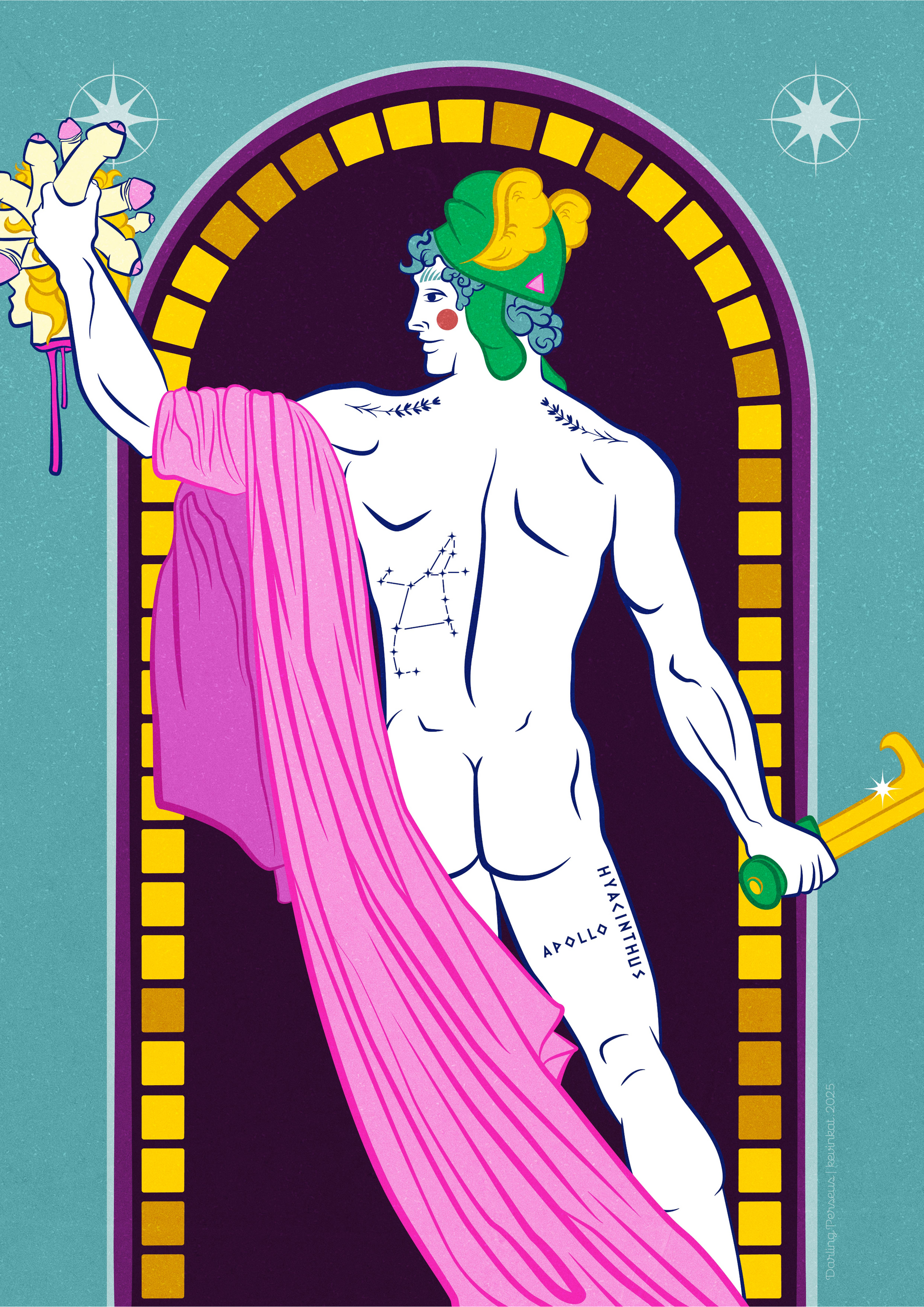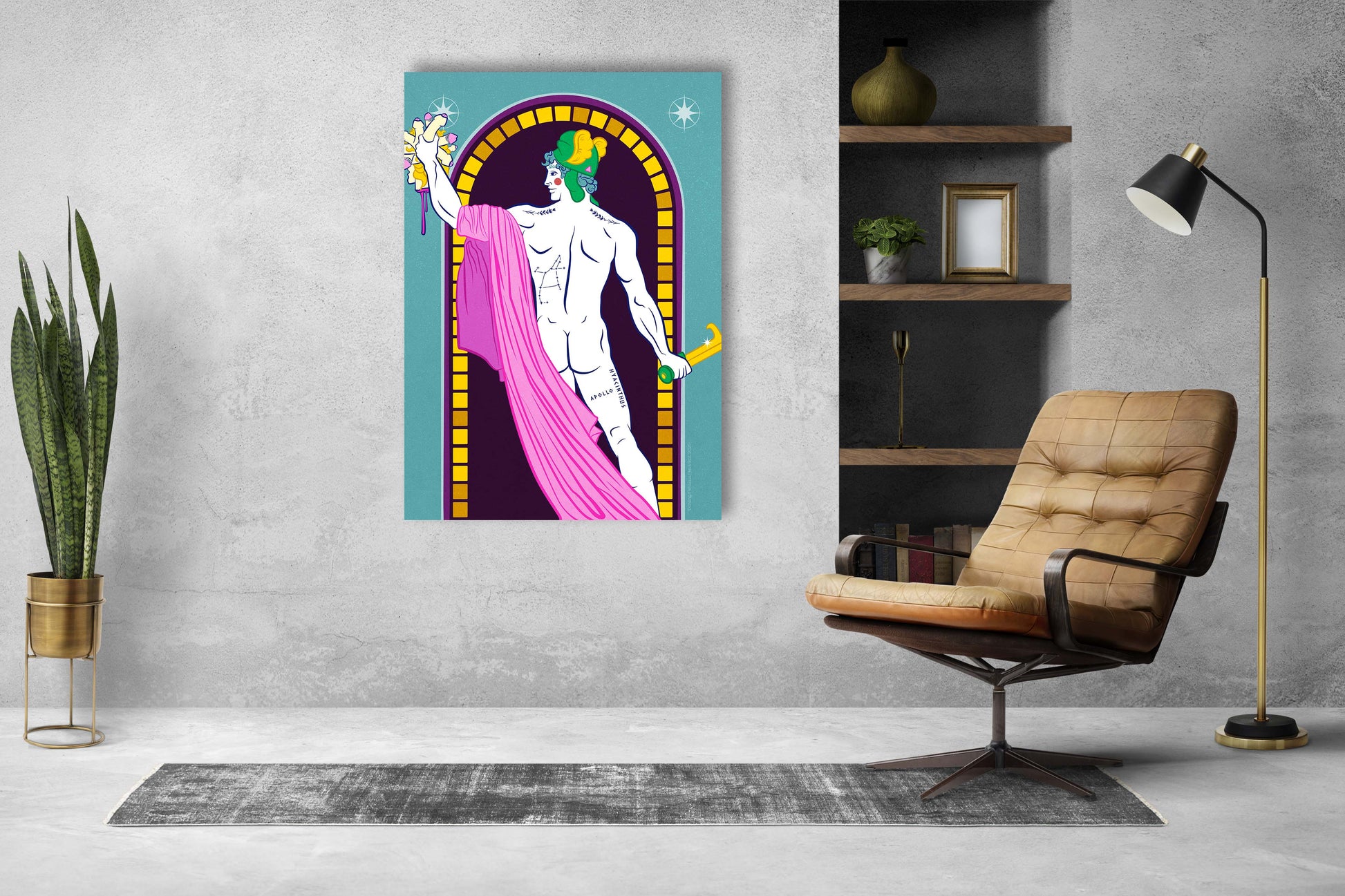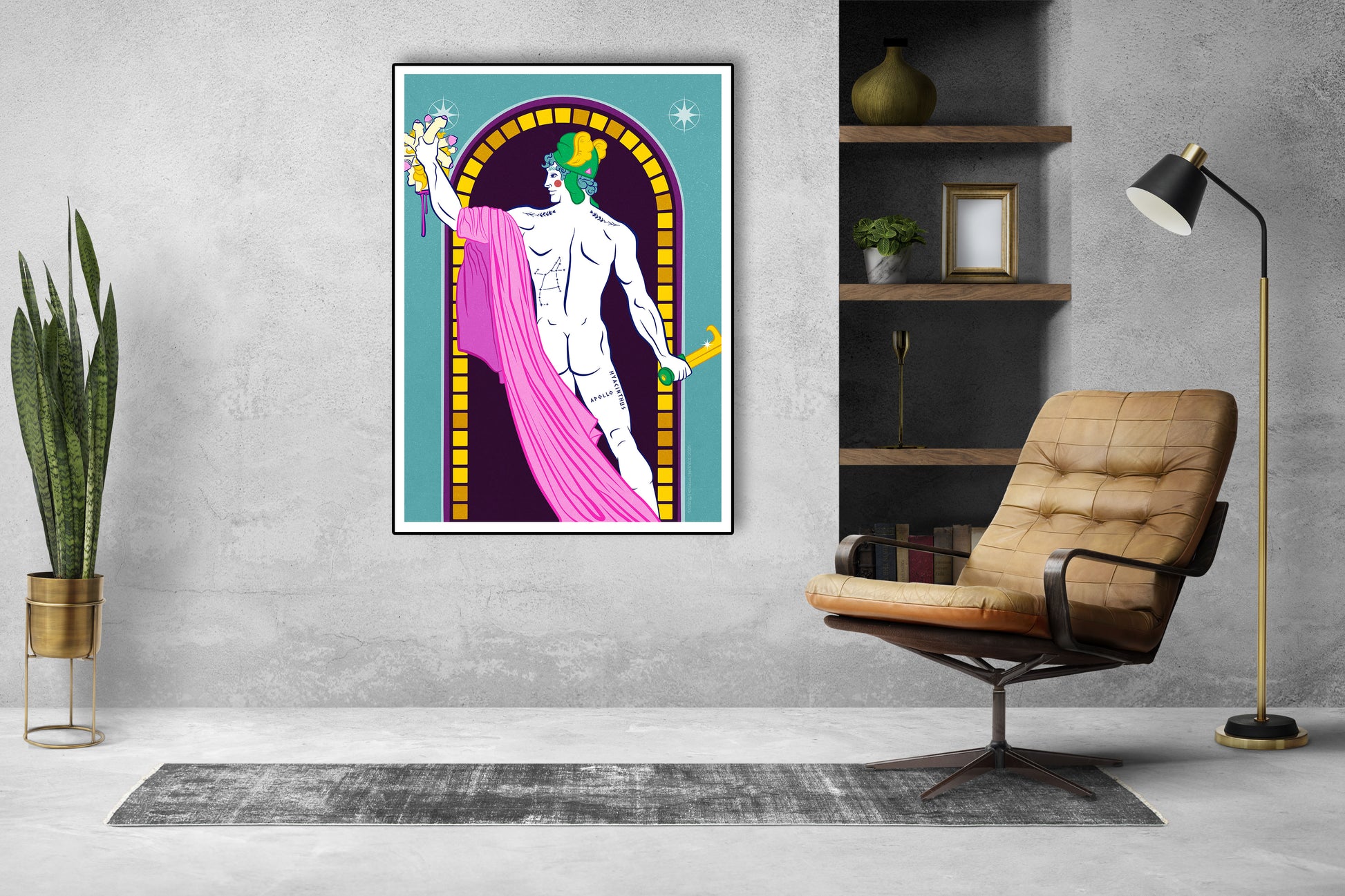 The sickle of Zeus in the one hand, and his trophy, the chopped head of Mandusa whose phallic locks made anyone rock hard that looked him directly in the eye. Perseus wears the Cap of Hades that could make him invisible and able to slay his demons, featuring a pink triangle that nods to the long road of queer liberation. The lavender tattoos on his shoulders are a symbol of homosexuality from the early 20th century and the constellation depicted is the Ancient Greek heavenly formation assigned to the heroic figure. His Hyacinthus and Apollo tattoo is a fanboy homage to one of the oldest gay love stories. Darling Perseus is myth meets mayhem, turning the classic hero into a campy queer icon ready to slay your wall.