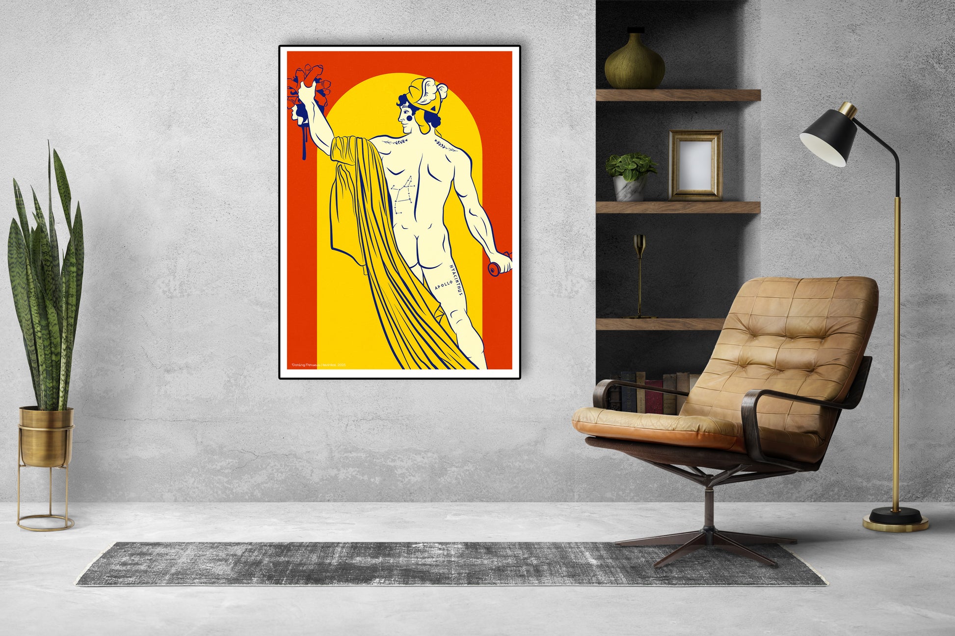 The sickle of Zeus in the one hand, and his trophy, the chopped head of Mandusa whose phallic locks made anyone rock hard that looked him directly in the eye. Perseus wears the Cap of Hades that could make him invisible and able to slay his demons, featuring a pink triangle that nods to the long road of queer liberation. The lavender tattoos on his shoulders are a symbol of homosexuality from the early 20th century and the constellation depicted is the Ancient Greek heavenly formation assigned to the heroic figure. His Hyacinthus and Apollo tattoo is a fanboy homage to one of the oldest gay love stories. Darling Perseus is myth meets mayhem, turning the classic hero into a campy queer icon ready to slay your wall.