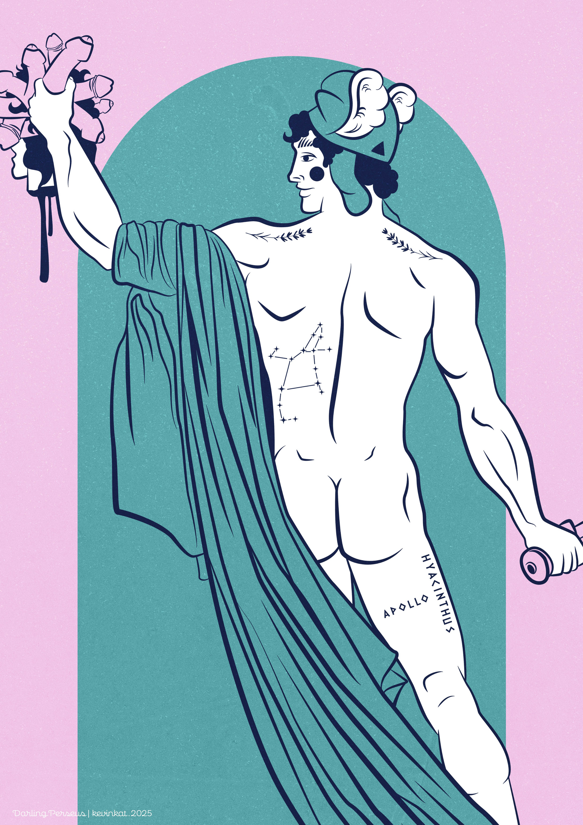 The sickle of Zeus in the one hand, and his trophy, the chopped head of Mandusa whose phallic locks made anyone rock hard that looked him directly in the eye. Perseus wears the Cap of Hades that could make him invisible and able to slay his demons, featuring a pink triangle that nods to the long road of queer liberation. The lavender tattoos on his shoulders are a symbol of homosexuality from the early 20th century and the constellation depicted is the Ancient Greek heavenly formation assigned to the heroic figure. His Hyacinthus and Apollo tattoo is a fanboy homage to one of the oldest gay love stories. Darling Perseus is myth meets mayhem, turning the classic hero into a campy queer icon ready to slay your wall.