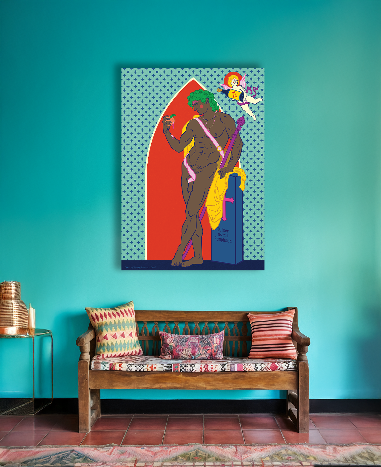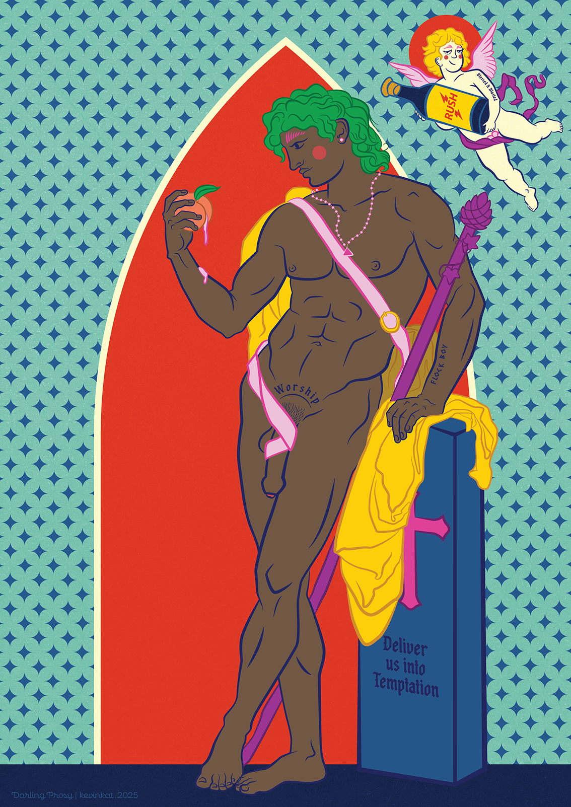 Darling Prosy was born from a meditation on the tension between religion and desire - how faith so often demands purity while the flesh burns for pleasure. This piece stares that hypocrisy dead in the eye and winks. The central figure is inspired by Le Berger Pâris (1787) by Jean-Baptiste Frédéric Desmarais - a Neoclassical nude that’s all muscle, myth, and coded homoeroticism. An early whisper of queer aesthetics in Western art, it renders Paris not as a hero, but as an object of longing. Perfect. We gave him a name: Prosy. That name? A nod to Prosymnus, the mortal shepherd who once made a very particular deal with Dionysus. The myth goes: Dionysus wanted passage to the Underworld. Prosymnus agreed - on one condition. Sex. The god accepted. But by the time he returned, Prosymnus was dead. Dionysus, ever the chaotic romantic, carved a phallus from fig wood and fulfilled the pact - right there at the gravesite. Divine dick appointment. So yes, Prosy is part shepherd, part sex symbol, part subversive saint. A vessel for all the beautiful contradictions we live: sacred and slutty, tender and perverse, eternal and ephemeral.