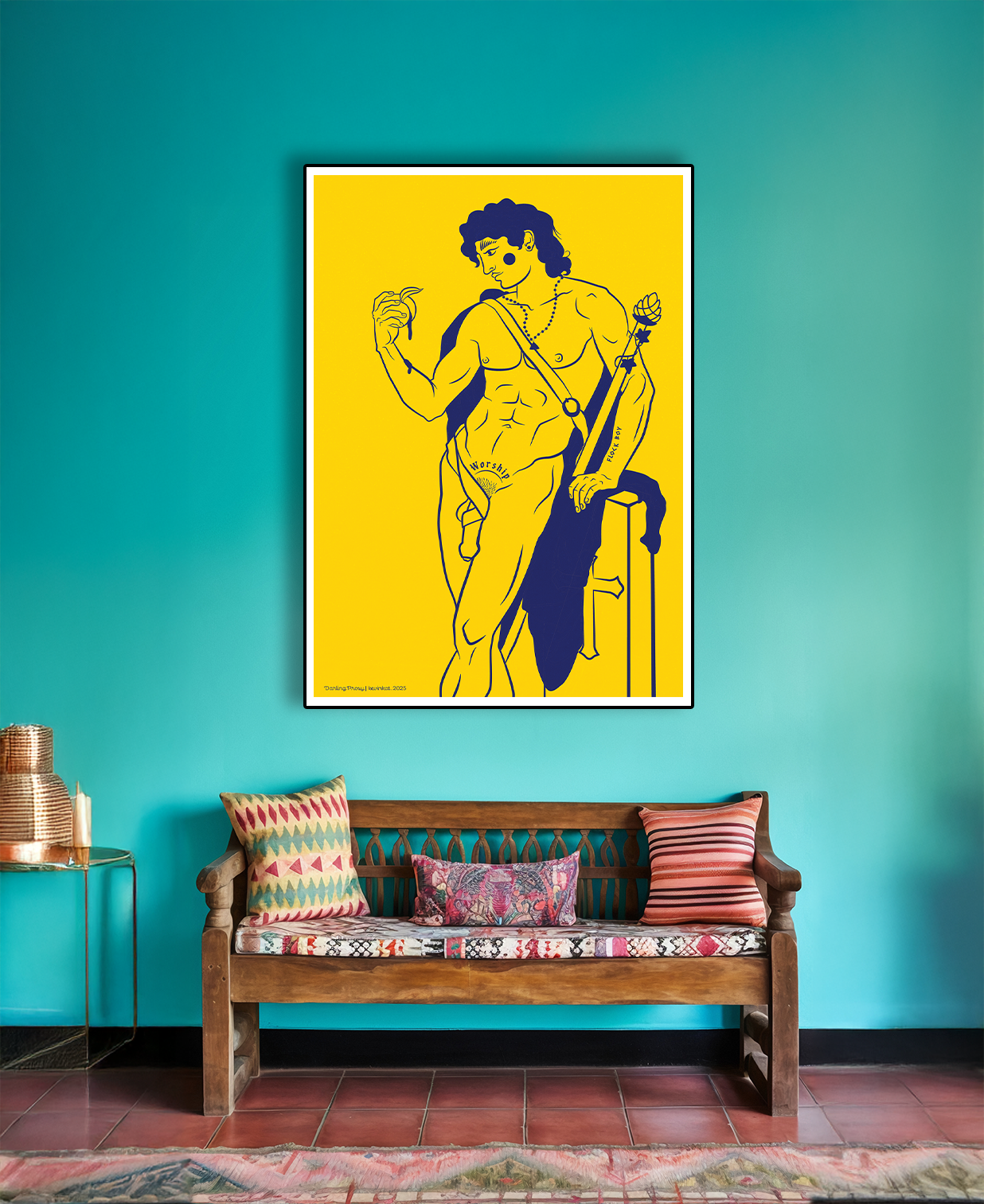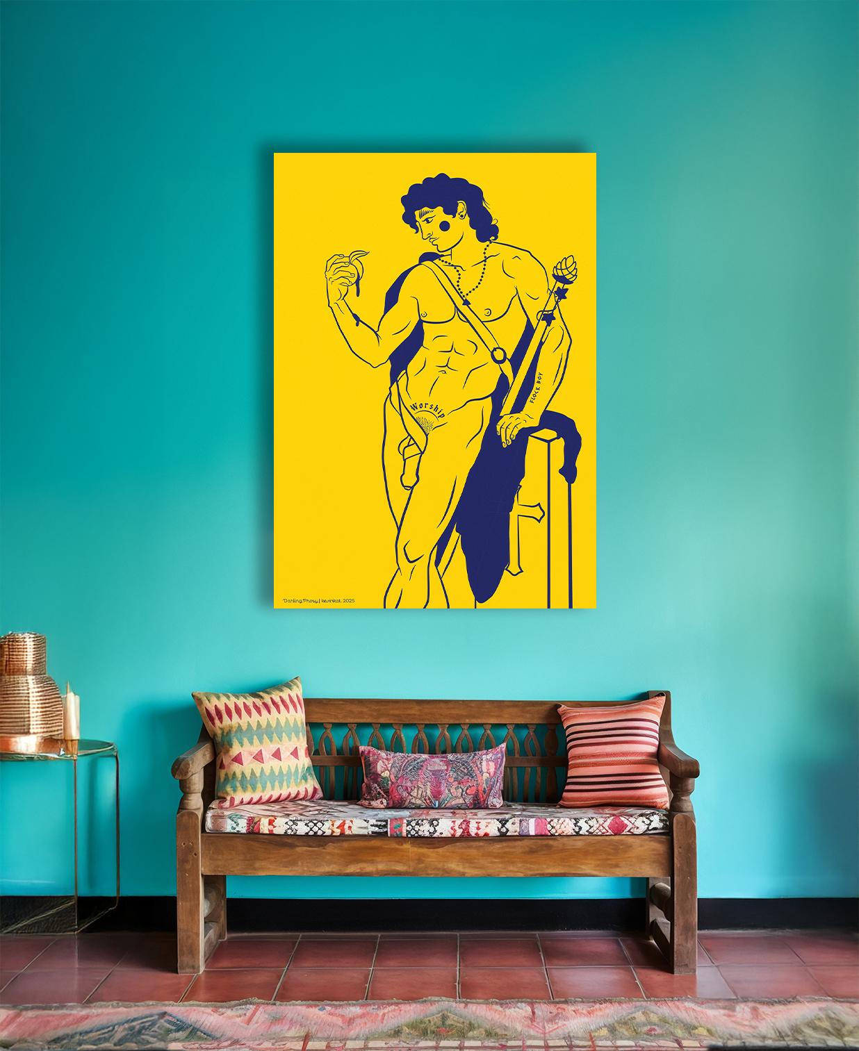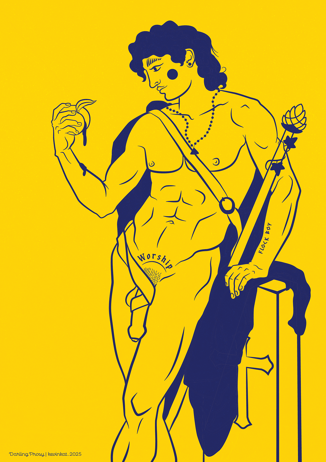 Darling Prosy was born from a meditation on the tension between religion and desire - how faith so often demands purity while the flesh burns for pleasure. This piece stares that hypocrisy dead in the eye and winks. The central figure is inspired by Le Berger Pâris (1787) by Jean-Baptiste Frédéric Desmarais - a Neoclassical nude that’s all muscle, myth, and coded homoeroticism. An early whisper of queer aesthetics in Western art, it renders Paris not as a hero, but as an object of longing. Perfect. We gave him a name: Prosy. That name? A nod to Prosymnus, the mortal shepherd who once made a very particular deal with Dionysus. The myth goes: Dionysus wanted passage to the Underworld. Prosymnus agreed - on one condition. Sex. The god accepted. But by the time he returned, Prosymnus was dead. Dionysus, ever the chaotic romantic, carved a phallus from fig wood and fulfilled the pact - right there at the gravesite. Divine dick appointment. So yes, Prosy is part shepherd, part sex symbol, part subversive saint. A vessel for all the beautiful contradictions we live: sacred and slutty, tender and perverse, eternal and ephemeral.