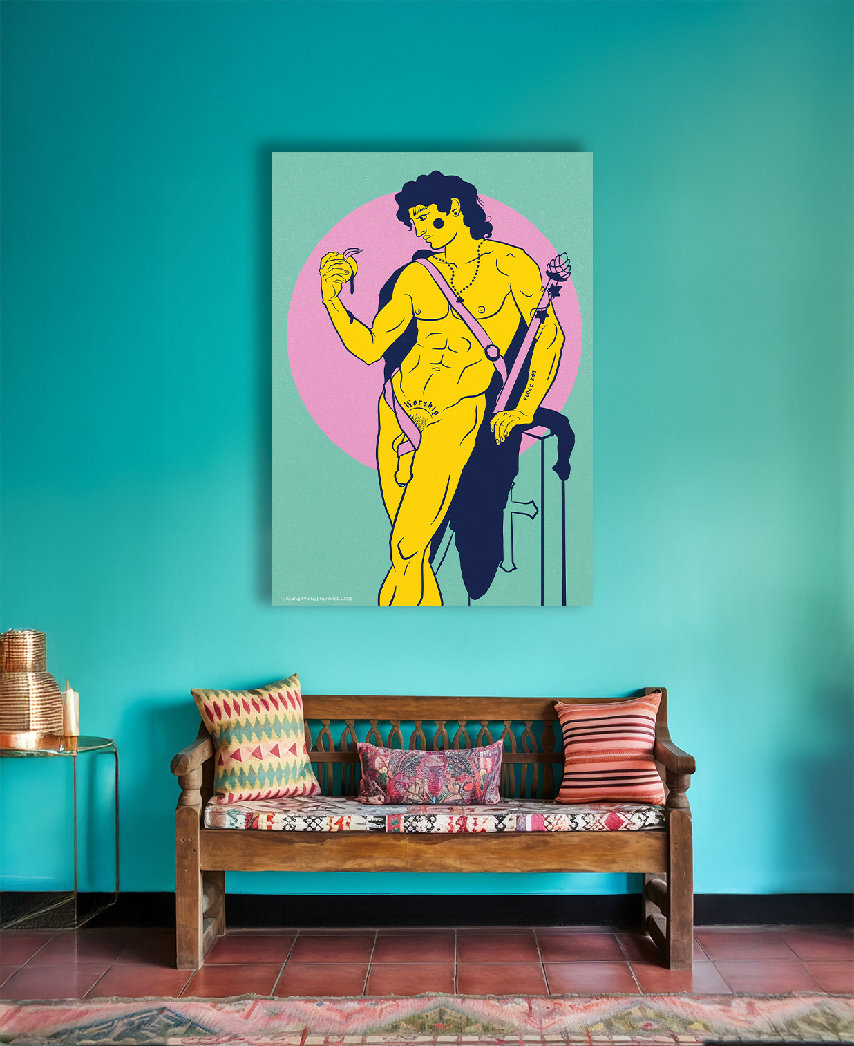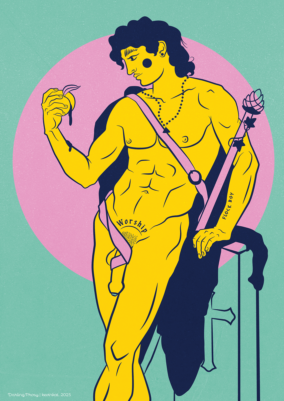 Darling Prosy was born from a meditation on the tension between religion and desire - how faith so often demands purity while the flesh burns for pleasure. This piece stares that hypocrisy dead in the eye and winks. The central figure is inspired by Le Berger Pâris (1787) by Jean-Baptiste Frédéric Desmarais - a Neoclassical nude that’s all muscle, myth, and coded homoeroticism. An early whisper of queer aesthetics in Western art, it renders Paris not as a hero, but as an object of longing. Perfect. We gave him a name: Prosy. That name? A nod to Prosymnus, the mortal shepherd who once made a very particular deal with Dionysus. The myth goes: Dionysus wanted passage to the Underworld. Prosymnus agreed - on one condition. Sex. The god accepted. But by the time he returned, Prosymnus was dead. Dionysus, ever the chaotic romantic, carved a phallus from fig wood and fulfilled the pact - right there at the gravesite. Divine dick appointment. So yes, Prosy is part shepherd, part sex symbol, part subversive saint. A vessel for all the beautiful contradictions we live: sacred and slutty, tender and perverse, eternal and ephemeral.