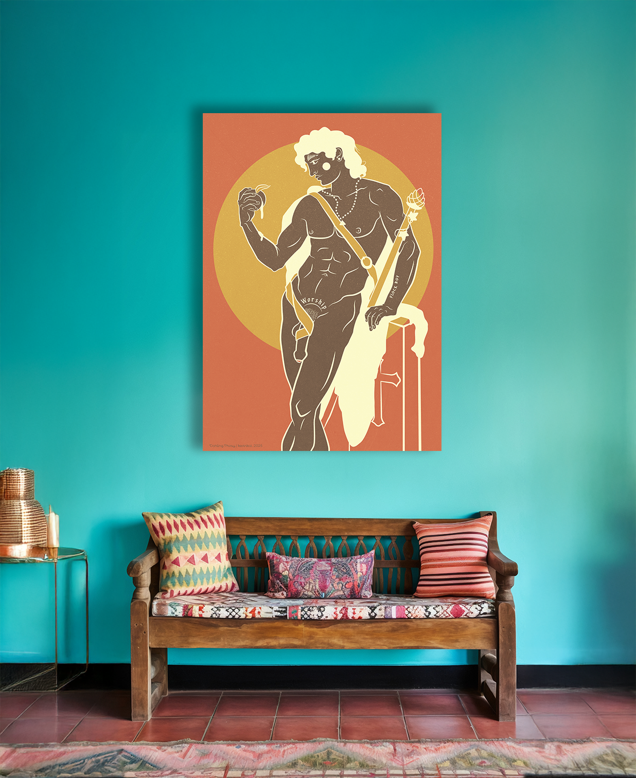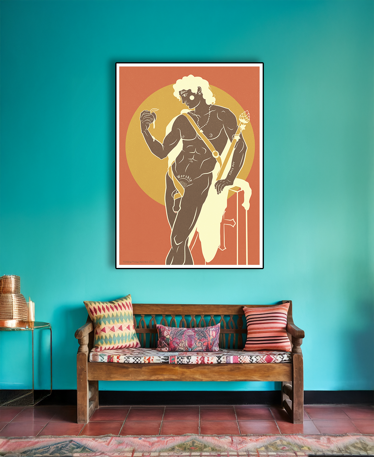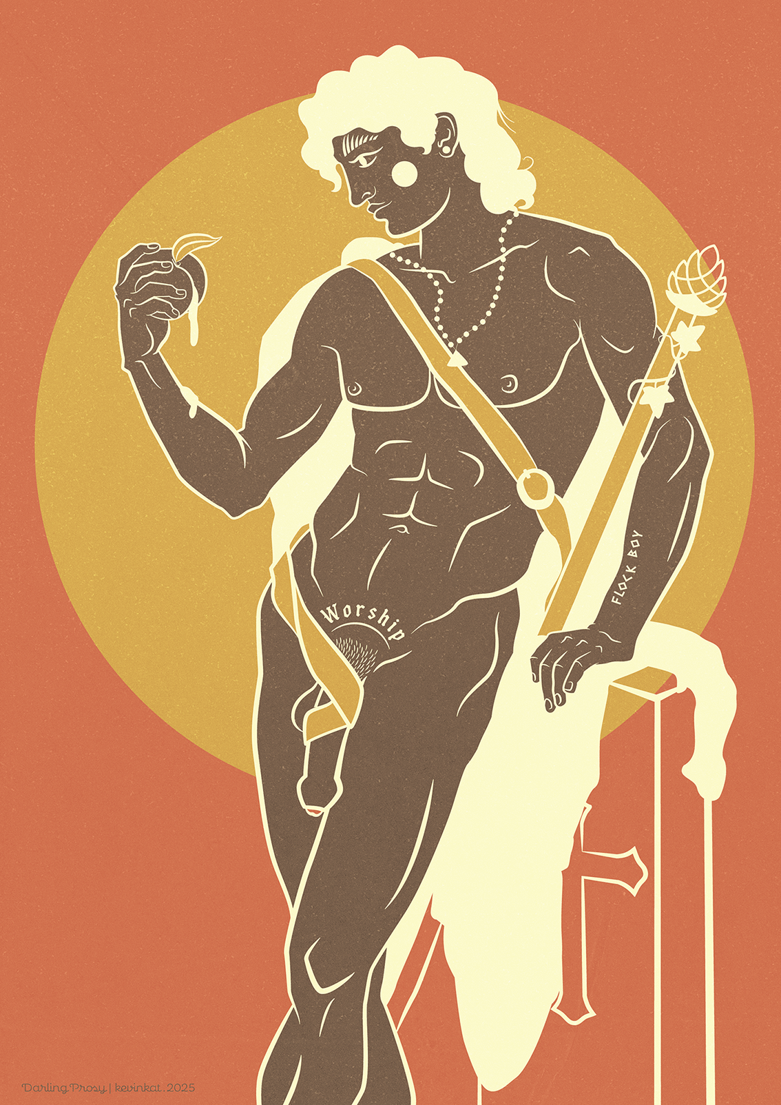 Darling Prosy was born from a meditation on the tension between religion and desire - how faith so often demands purity while the flesh burns for pleasure. This piece stares that hypocrisy dead in the eye and winks. The central figure is inspired by Le Berger Pâris (1787) by Jean-Baptiste Frédéric Desmarais - a Neoclassical nude that’s all muscle, myth, and coded homoeroticism. An early whisper of queer aesthetics in Western art, it renders Paris not as a hero, but as an object of longing. Perfect. We gave him a name: Prosy. That name? A nod to Prosymnus, the mortal shepherd who once made a very particular deal with Dionysus. The myth goes: Dionysus wanted passage to the Underworld. Prosymnus agreed - on one condition. Sex. The god accepted. But by the time he returned, Prosymnus was dead. Dionysus, ever the chaotic romantic, carved a phallus from fig wood and fulfilled the pact - right there at the gravesite. Divine dick appointment. So yes, Prosy is part shepherd, part sex symbol, part subversive saint. A vessel for all the beautiful contradictions we live: sacred and slutty, tender and perverse, eternal and ephemeral.