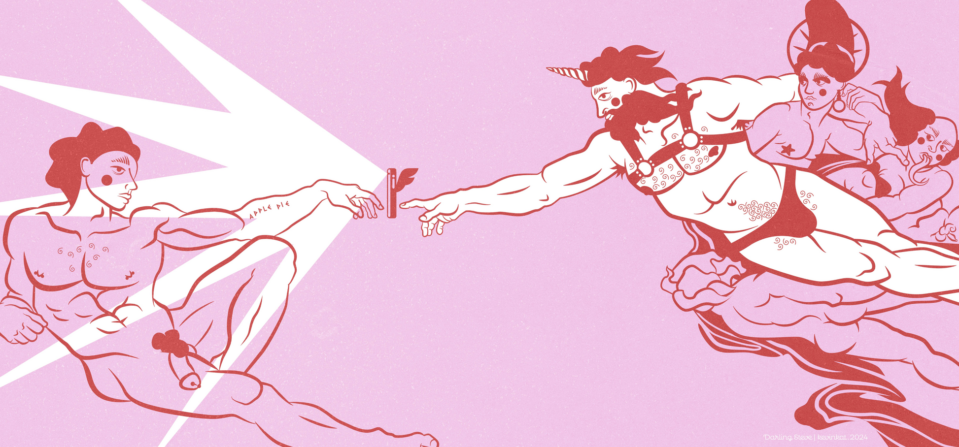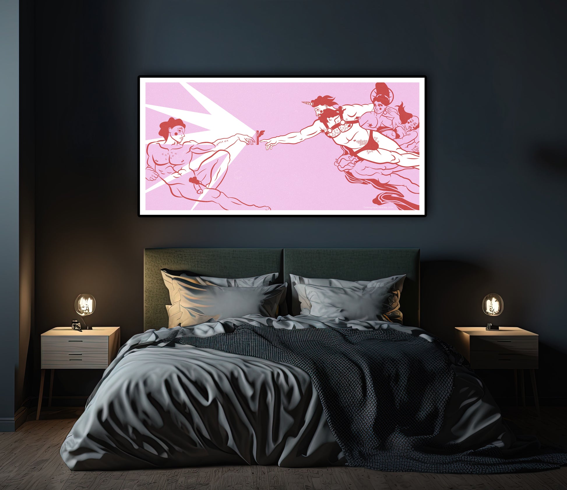 Michelangelo could never. Darling Steve reimagines the act of creation, the separation between heaven and earth is an iPhone held afloat by wings from the Only Fans logo. On the one side the perfect male: Steve as in gay, and not Eve as in the Bible. On the other, his holy audience, watching in admiration. This scene celebrates the gay content creator and those who are in seventh heaven dropping $6.50 to access the uncensored glory of Eden.