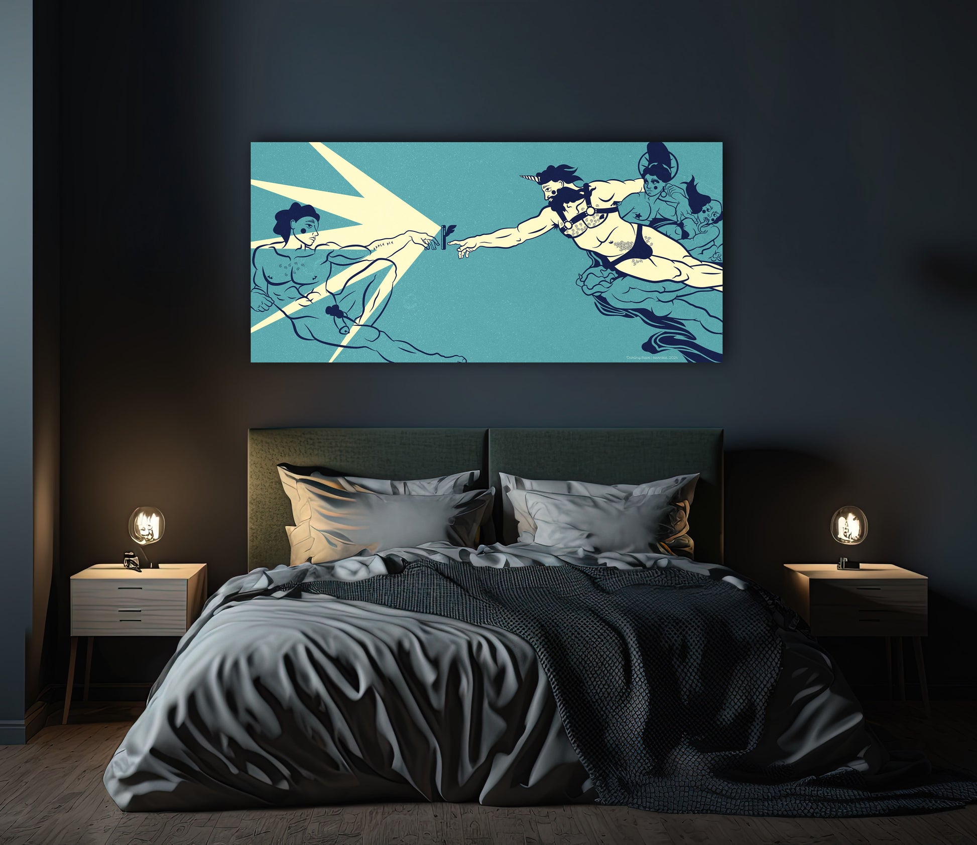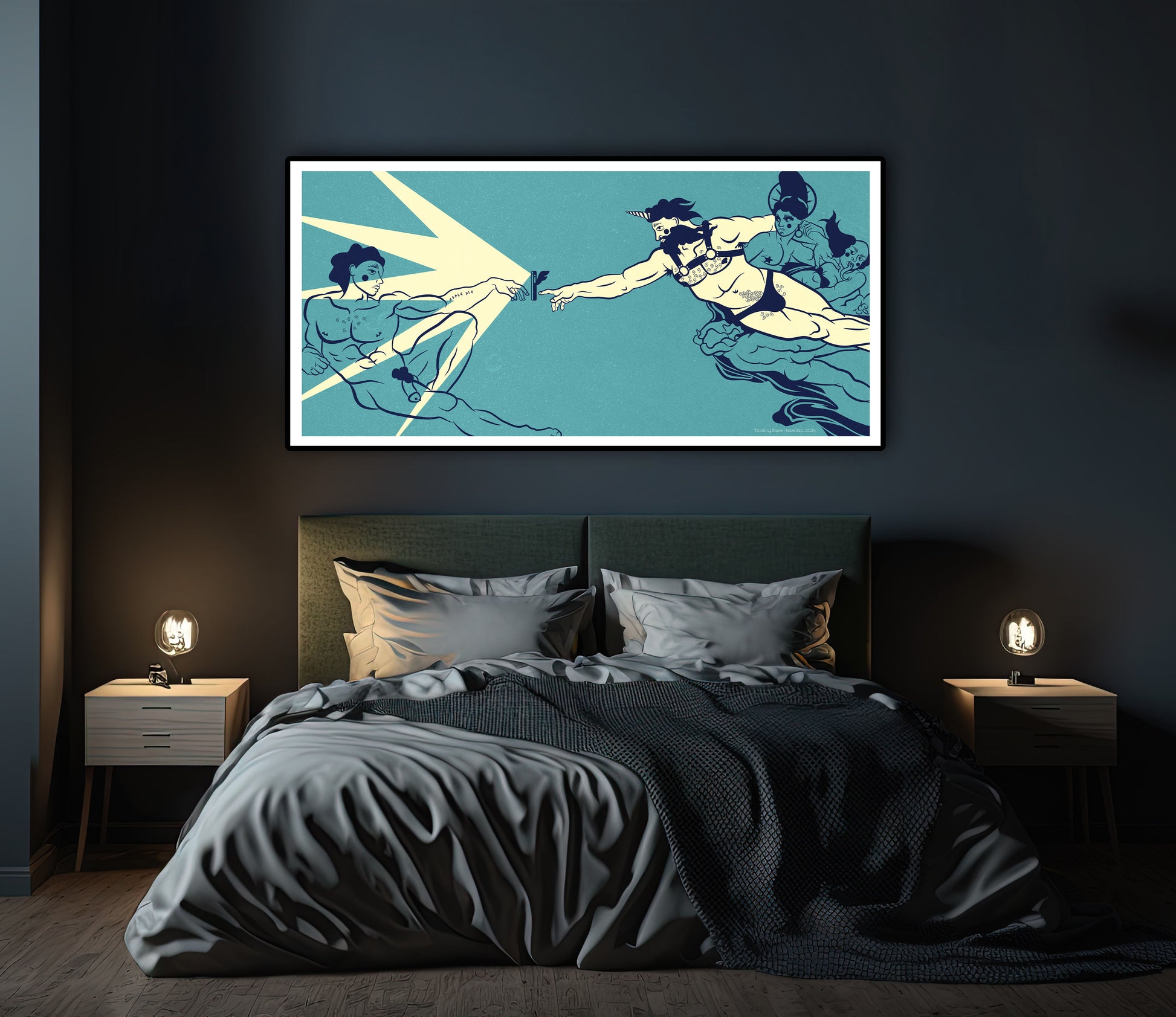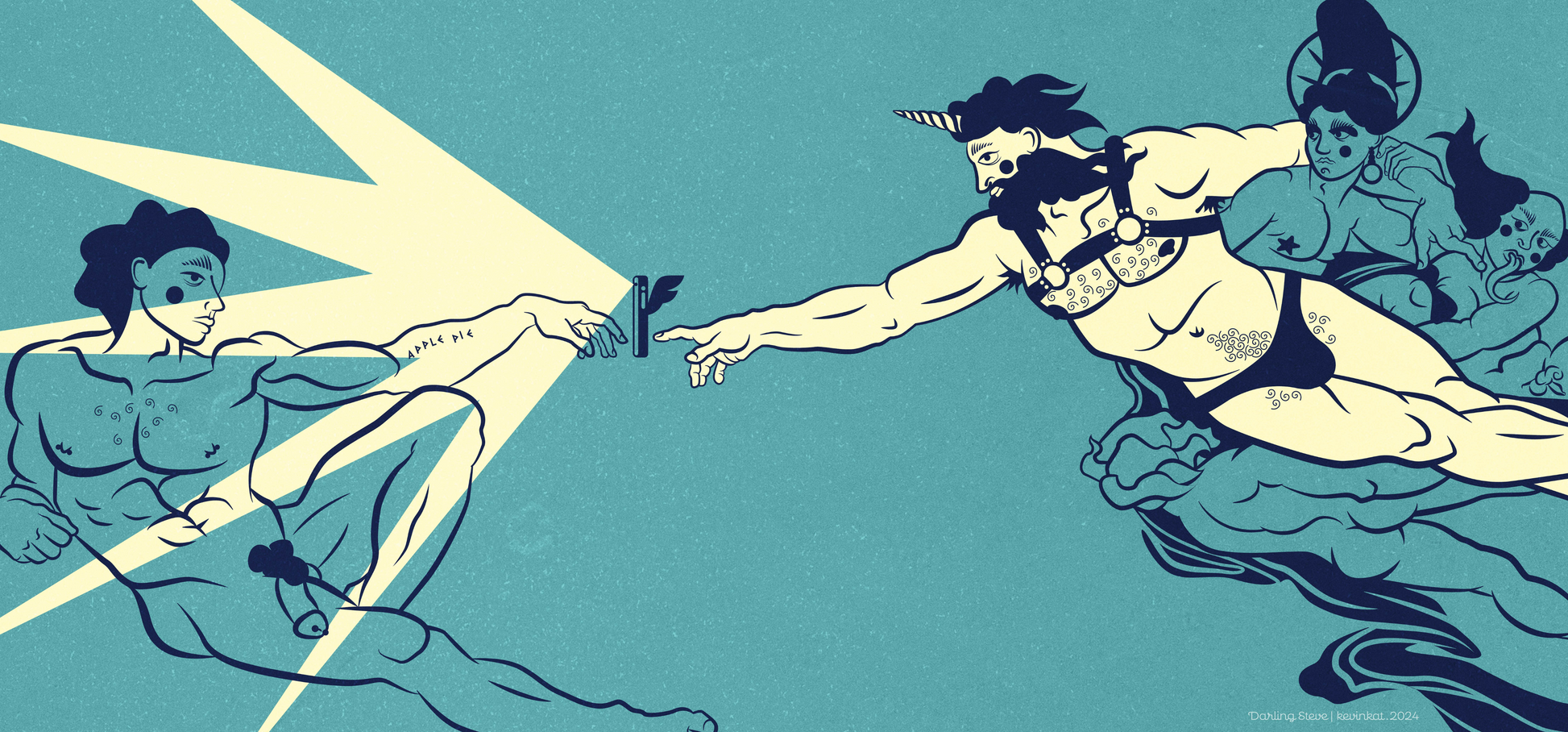 Michelangelo could never. Darling Steve reimagines the act of creation, the separation between heaven and earth is an iPhone held afloat by wings from the Only Fans logo. On the one side the perfect male: Steve as in gay, and not Eve as in the Bible. On the other, his holy audience, watching in admiration. This scene celebrates the gay content creator and those who are in seventh heaven dropping $6.50 to access the uncensored glory of Eden.