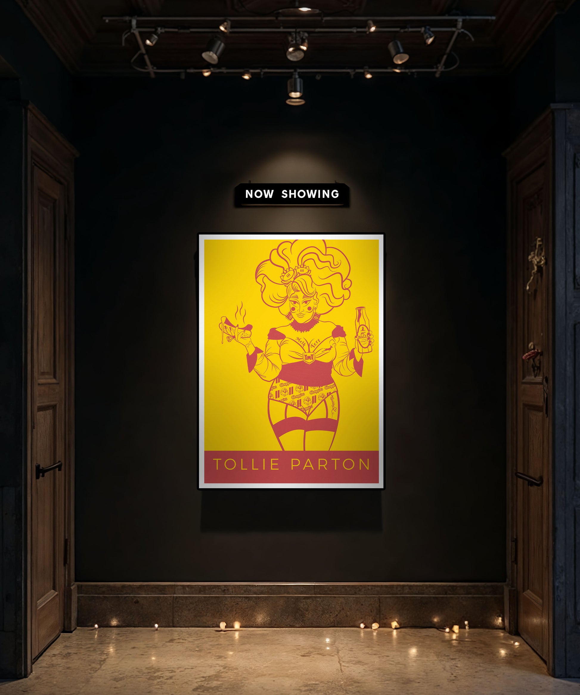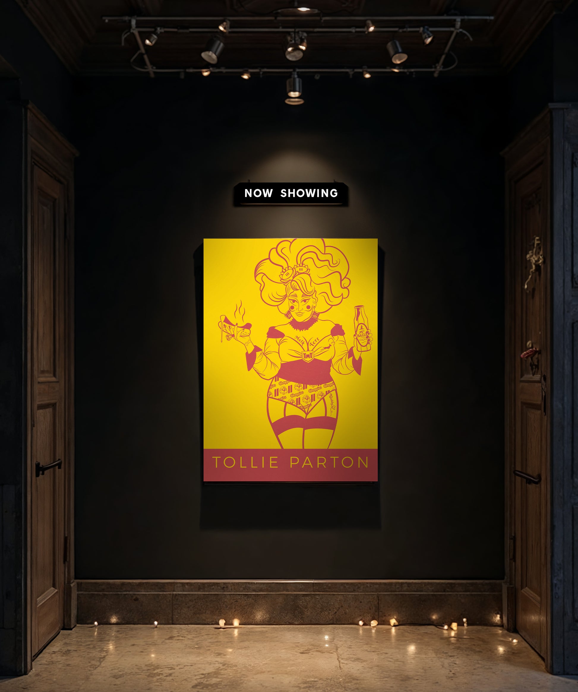 ’n Checkers Championship Boerewors queen. Sy’s ’n boshaar bombshell wat ongeskaamd haar Chappies eekkoring pronk op die voorblad van Huisgenoot na gereelde aanlyn uitvalle met internet trolle. Drenched in jewels, en ’n neck piece geïnspireer deur Zambuk verpakking, ontmoet vir Darling Tollie, die pienk-blonde, dapper as hell drag-ster van die Afrikaanse verhoog. Dié is ’n tong-in-die- kies huldeblyk aan ’n ikoon, herverbeel met al die heerlike chaos van Suid-Afrikaanse geur – en hope seksappeal. Sy sing Ons is TROTS graag uit volle bors en is gedoop in Mrs Balls. Hierdie print is ’n klewerige, vurige, sexy viering van kultuur, kamp en trots Afrikaanse nostalgie. Sy bedien nie net ’n look nie - sy bedien lokale lus. Gegeur vir die ouens. Sossig vir die stiekers. ’n Liefdesbrief aan waar ons vandaan kom, met ’n wink vir waarheen ons op pad is.