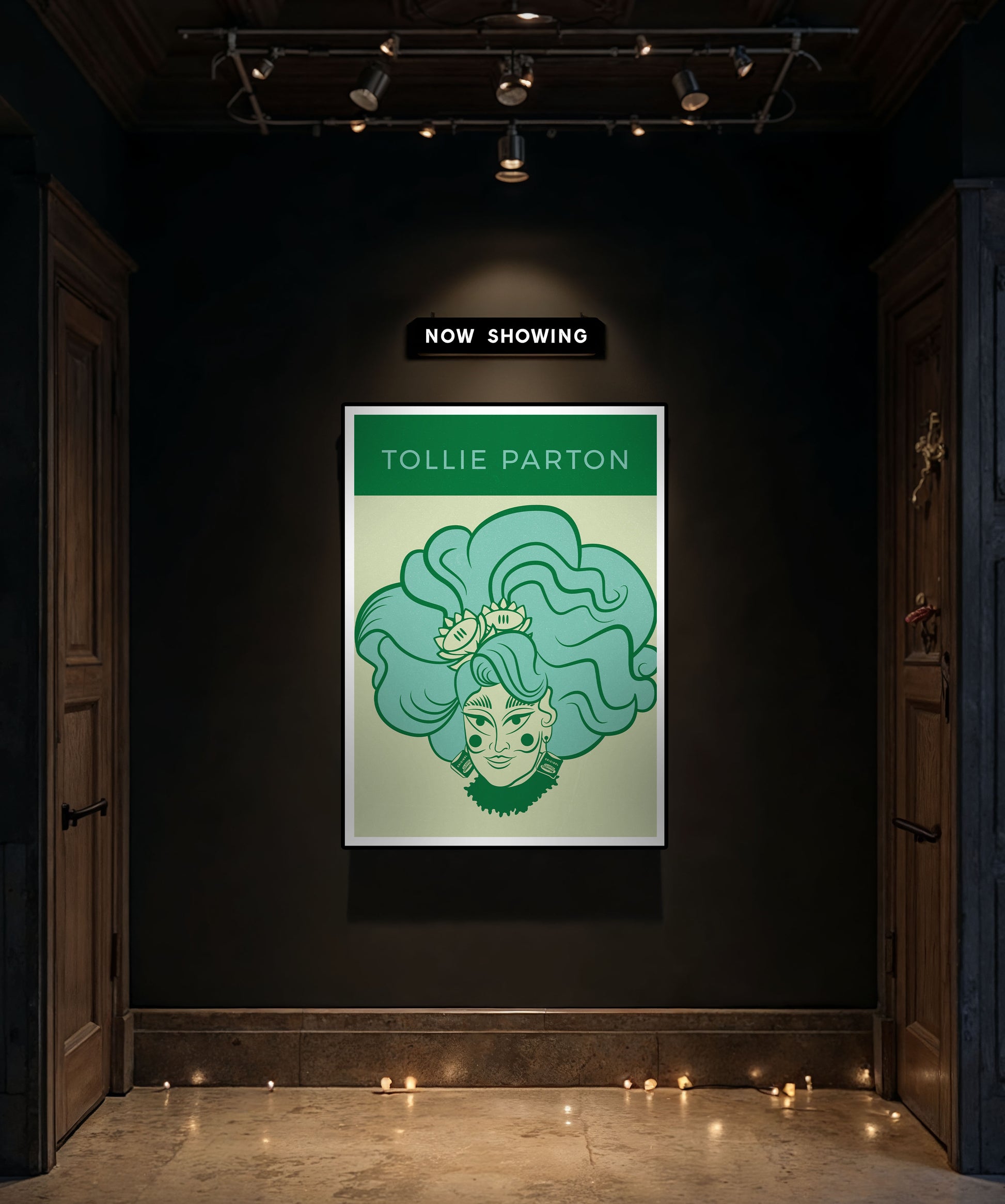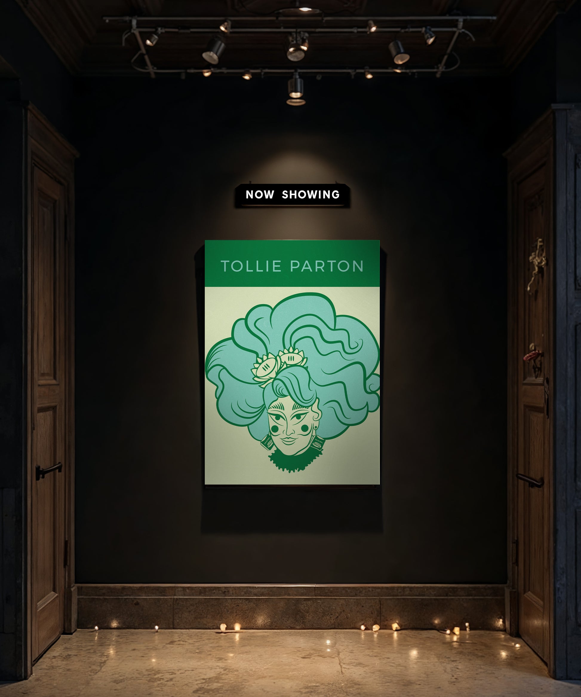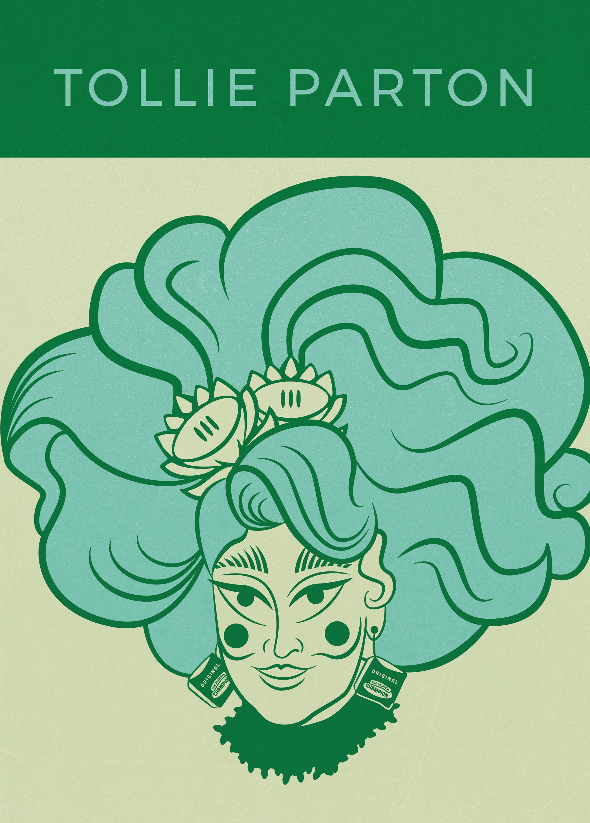 ’n Checkers Championship Boerewors queen. Sy’s ’n boshaar bombshell wat ongeskaamd haar Chappies eekkoring pronk op die voorblad van Huisgenoot na gereelde aanlyn uitvalle met internet trolle. Drenched in jewels, en ’n neck piece geïnspireer deur Zambuk verpakking, ontmoet vir Darling Tollie, die pienk-blonde, dapper as hell drag-ster van die Afrikaanse verhoog. Dié is ’n tong-in-die- kies huldeblyk aan ’n ikoon, herverbeel met al die heerlike chaos van Suid-Afrikaanse geur – en hope seksappeal. Sy sing Ons is TROTS graag uit volle bors en is gedoop in Mrs Balls. Hierdie print is ’n klewerige, vurige, sexy viering van kultuur, kamp en trots Afrikaanse nostalgie. Sy bedien nie net ’n look nie - sy bedien lokale lus. Gegeur vir die ouens. Sossig vir die stiekers. ’n Liefdesbrief aan waar ons vandaan kom, met ’n wink vir waarheen ons op pad is.