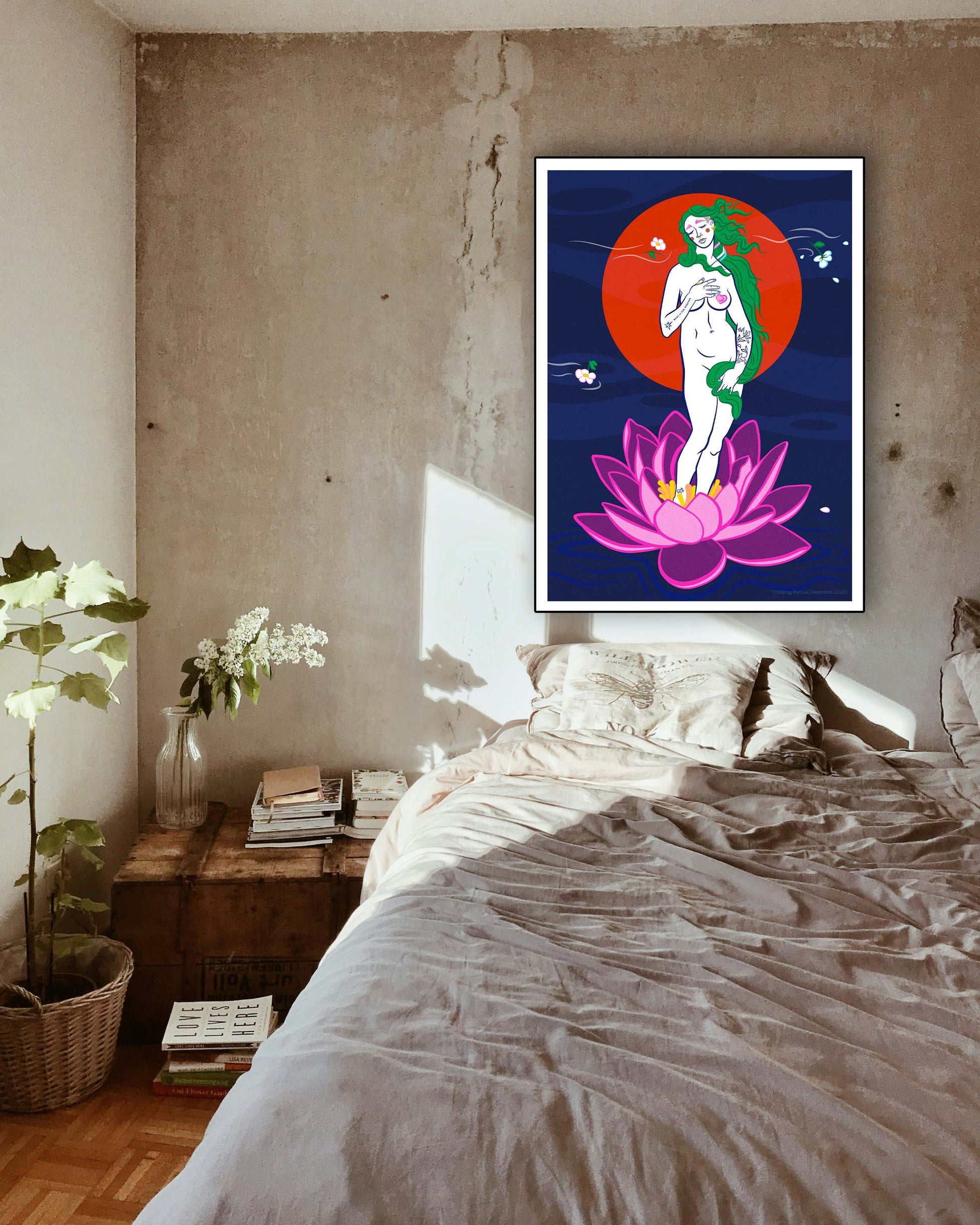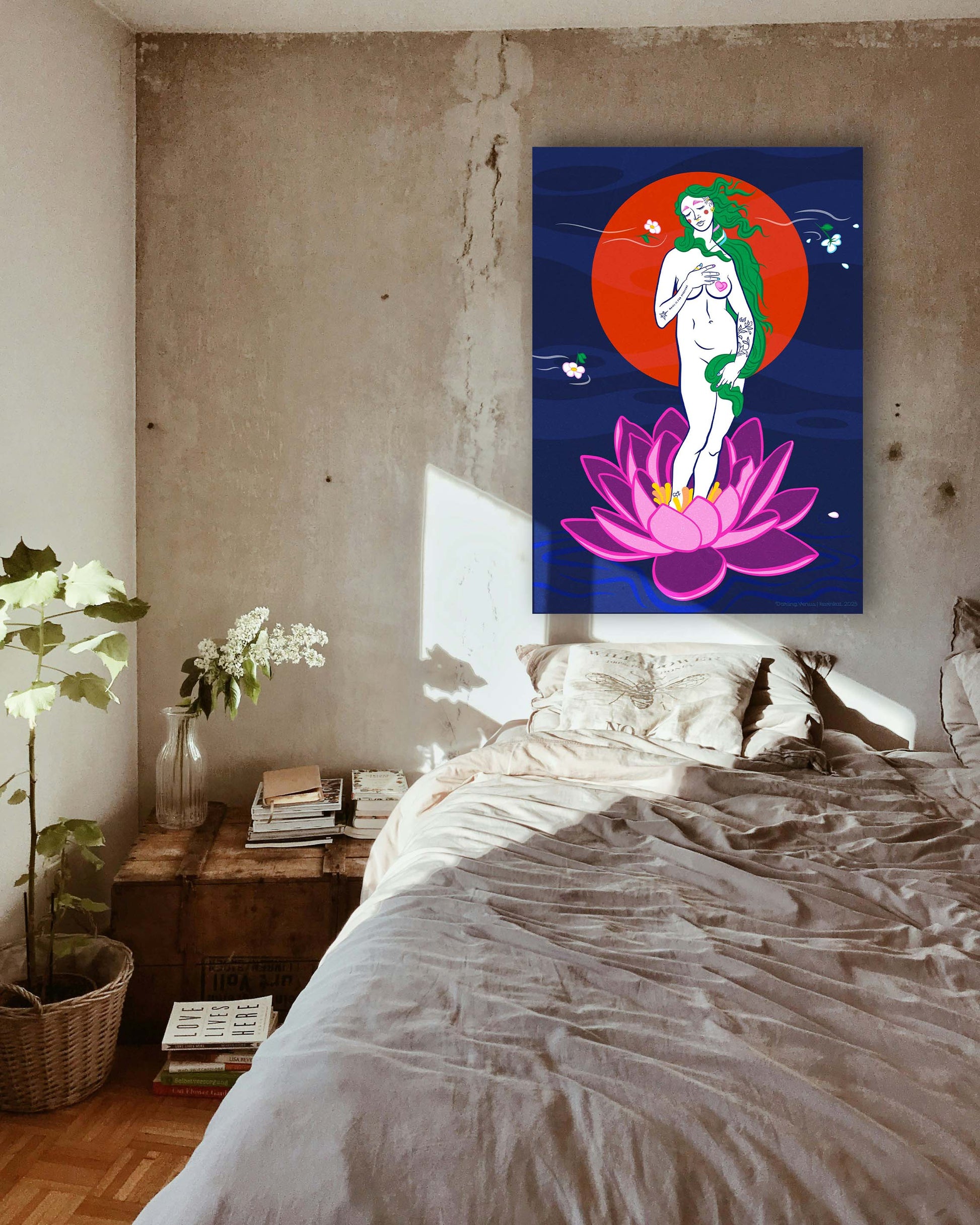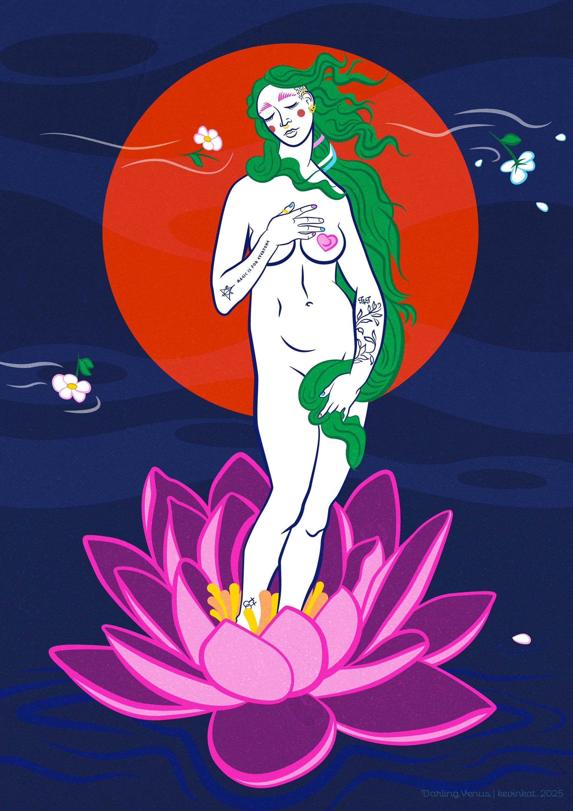 Rise and radiate, honey. Darling Venus emerges from a blooming lotus in all her divine nude glory, unapologetic, and completely unbothered by your earthly opinions. She’s soft, seductive, and just a little bit smug about how good she looks. This work is a celebration of the feminine, using colours from the lesbian and trans flags. Her T4T tattoo, undercut, piercings and thumb ring all speak to markers of women in the queer community. Inspired by the Birth of Venus, this work is about rebirth, gender and affirmations of beauty and truth.