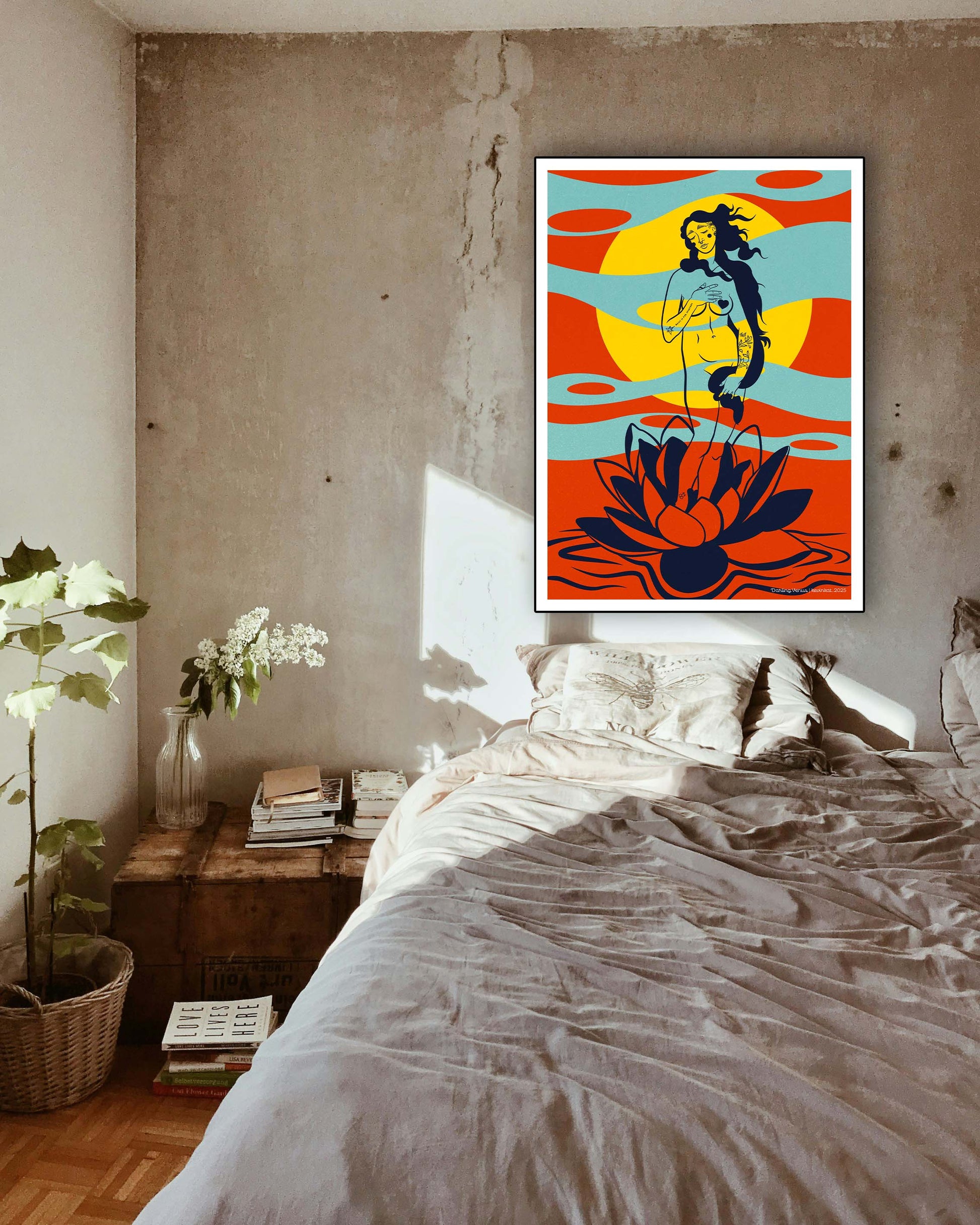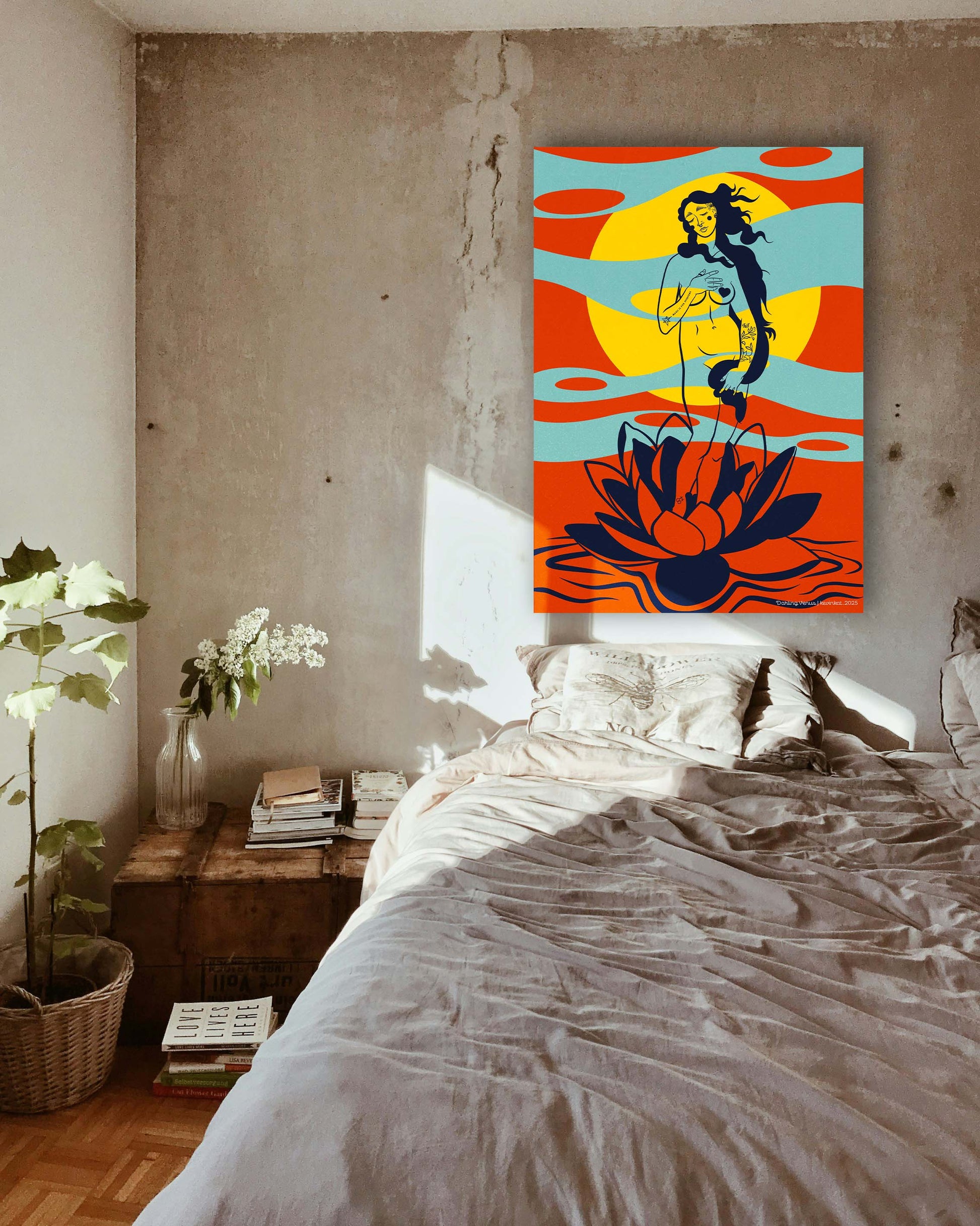 Rise and radiate, honey. Darling Venus emerges from a blooming lotus in all her divine nude glory, unapologetic, and completely unbothered by your earthly opinions. She’s soft, seductive, and just a little bit smug about how good she looks. This work is a celebration of the feminine, using colours from the lesbian and trans flags. Her T4T tattoo, undercut, piercings and thumb ring all speak to markers of women in the queer community. Inspired by the Birth of Venus, this work is about rebirth, gender and affirmations of beauty and truth.