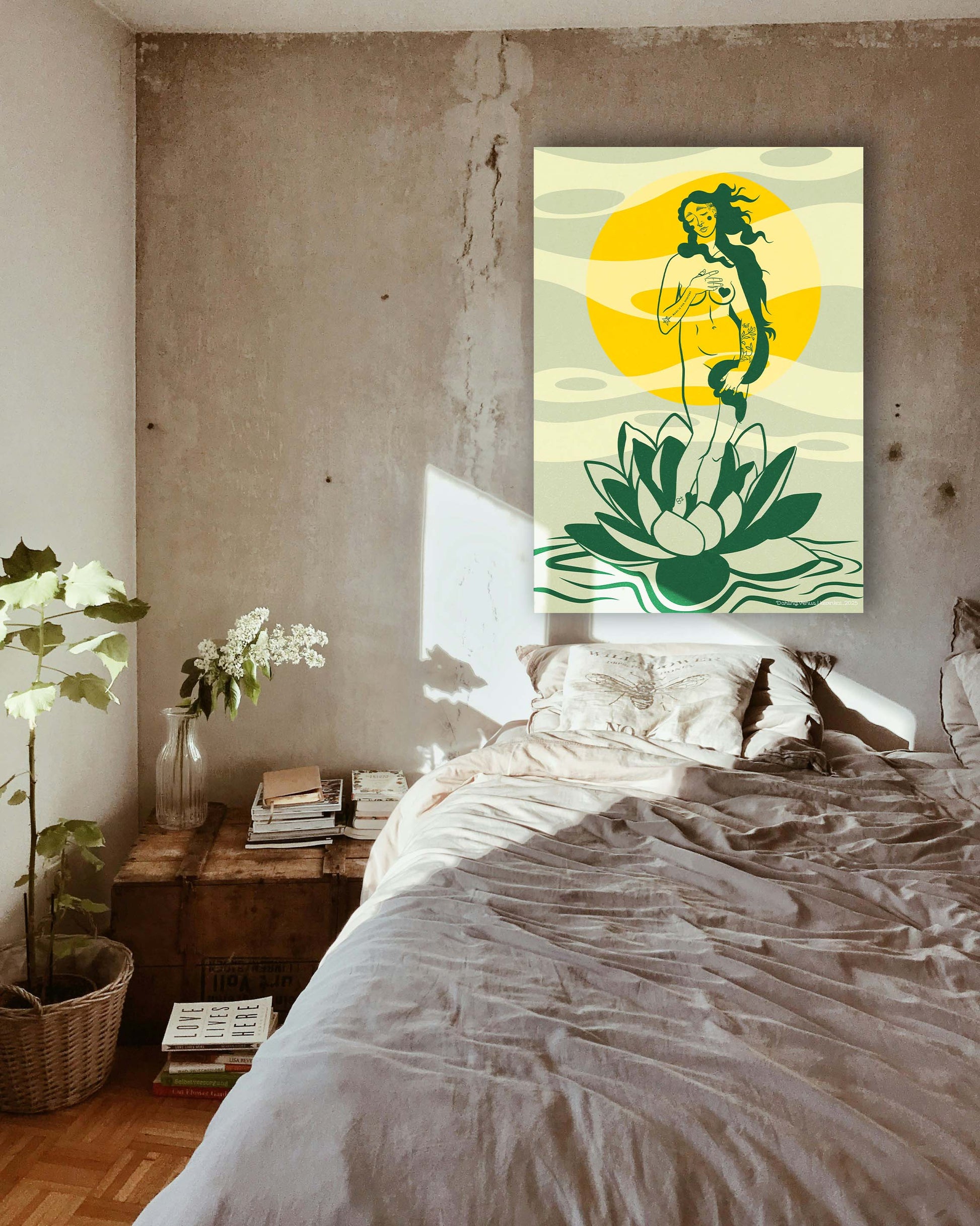 Rise and radiate, honey. Darling Venus emerges from a blooming lotus in all her divine nude glory, unapologetic, and completely unbothered by your earthly opinions. She’s soft, seductive, and just a little bit smug about how good she looks. This work is a celebration of the feminine, using colours from the lesbian and trans flags. Her T4T tattoo, undercut, piercings and thumb ring all speak to markers of women in the queer community. Inspired by the Birth of Venus, this work is about rebirth, gender and affirmations of beauty and truth.
